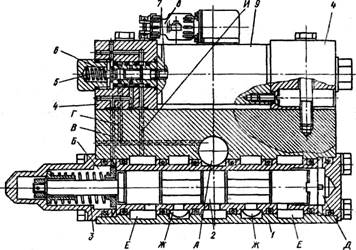 У нейтральному положенні (як показано на малюнку) золотники 7 перекривають робочі порожнини Ж, И гідроциліндрів і через свердління Б повідомляють порожнини А и В зі зливом. Рідина від насоса надходить у порожнину Д, створює в ній тиск більше, ніж у порожнинах А и В і з'єднаному з ними просторі над верхнім паском гідроклапана 9, переборює опір пружини 8 і піднімає гідроклапан, повідомляючи порожнину Д с порожниною зливу Е. Тому що порожнини Ж, И гідроциліндрів замкнені, те кероване ними робоче устаткування утримується в заданому положенні.
