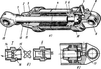 Гідроциліндри, застосовувані на різних бульдозерах і скреперах, розрізняються головним чином робочим діаметром і ходом штока. По конструкції гідроциліндри принципово подібні розглянутому на Рис. 11, а. У гідроциліндрах робочого устаткування деяких бульдозерів для зменшення швидкості опускання відвала у свердліннях, через які підводять робочу рідину до штокової порожнини, установлюють уповільнюючий клапан (Рис. 11, б). Клапан 14 являє собою штуцер, у якому розміщена фасонна шайба 15. Її осьове переміщення обмежене штифтом 16.