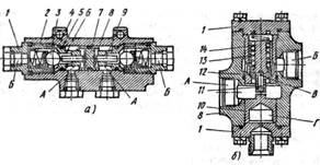 Гідрозамок гідророзкосу (Рис. 11, а) складається з корпуса 8, закритого двома кришками 1, усередині якого розміщені кулькові клапани. Працює гідрозамок у такий спосіб. При подачі робочої рідини, наприклад, у ліву порожнину А під тиском ліва кулька 3 переборює опір пружини 2 і відкриває доступ потоку в порожнину Б, зв'язану гідролінією зі штоковою порожниною гідророзкосу 7. Шток гідророзкосу починає переміщатися праворуч і штовхальником 9 зрушує кульку 3, відкривши тим самим злив із правої порожнини гідророзкосу через праві порожнини Б и А гідрозамка в гідророзподільник 5 і гідробак 1. У нейтральному положенні обидві кульки 3 під дією пружин 2, а також під тиском рідини в гідророзкосі, що виникає при зовнішніх навантаженнях, притискаються до сідел 4, надійно перекривши перетекание робочої рідини між порожнинами гідророзкосу.