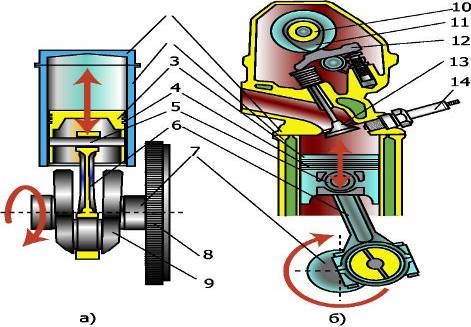 Рис. 6 Одноцилиндровый карбюраторный двигатель внутреннего сгорания а) "стакан" в "стакане"; б) поперечный разрез 1 - головка цилиндра; 2 - цилиндр; 3 - поршень; 4 - поршневые кольца; 5 - поршневой палец; 6 - шатун; 7 - коленчатый вал; 8 - маховик; 9 - кривошип; 10 - распределительный вал; 11 - кулачок распределительного вала; 12 - рычаг; 13 - клапан; 14 - свеча зажигания