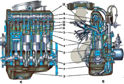 а) продольный разрез; б) поперечный разрез 1 - блок цилиндров; 2 - головка блока цилиндров; 3 - поддон картера двигателя; 4 - поршни с кольцами и пальцами; 5 - шатуны; 6 -коленчатый вал; 7 - маховик; 8 - распределительный вал; 9 - рычаги; 10 - впускные клапаны; 11 - выпускные клапаны; 12 - пружины клапанов; 13 - впускные и выпускные каналы