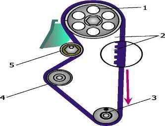 1 - коленчатый вал двигателя; 2 - маховик с зубчатым венцом; 3 - шатунная шейка; 4 - коренная (опорная) шейка; 5 –противовес