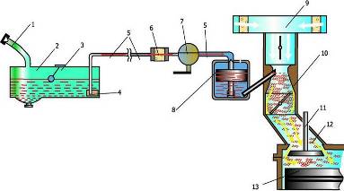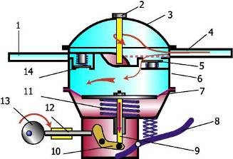 1 - корпус воздушного фильтра; 2 - фильтрующий элемент; 3 -всасывающий коллектор вентиляции картера; 4 - карбюратор; 5 - впускной трубопровод; 6 - впускной клапан; 7 - шланг вентиляции картера; 8 - маслоотделитель; 9 - сливная трубка маслоотделителя; 10 - картер двигателя; 11 - поддон картера