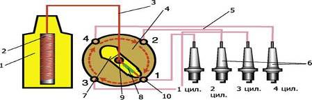 После того, как в катушке зажигания образовался ток высокого напряжения, он попадает (по высоковольтному проводу) на центральный контакт крышки распределителя, а затем через подпружиненный контактный уголек на пластину ротора. Во время вращения ротора ток "соскакивает" с его пластины, через небольшой воздушный зазор, на боковые контакты крышки. Далее, через высоковольтные провода, импульс тока высокого напряжения попадает к свечам зажигания.