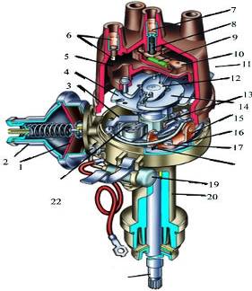1 - диафрагма вакуумного регулятора; 2 - корпус вакуумного регулятора; 3 - тяга; 4 - опорная пластина; 5 - ротор распределителя ("бегунок"); 6 - боковой контакт крышки; 7 - центральный контакт крышки; 8 - контактный уголек; 9 - резистор; 10 - наружный контакт пластины ротора; 11 - крышка распределителя; 12 - пластина центробежного регулятора; 13 - кулачек прерывателя; 14 - грузик; 15 -контактная группа; 16 - подвижная пластина прерывателя; 17 - винт крепления контактной группы; 18 - паз для регулировки зазоров в контактах; 19 - конденсатор; 20 - корпус прерывателя-распределителя; 21 - приводной валик; 22 - фильц для смазки кулачка