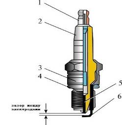 1 - контактная гайка; 2 - изолятор; 3 - корпус; 4 - уплотнительное кольцо; 5 - центральный электрод; 6 - боковой электрод