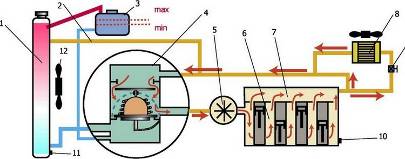 1 - радиатор; 2 - патрубок для циркуляции охлаждающей жидкости; 3 - расширительный бачок; 4 - термостат; 5 - водяной насос; 6 -рубашка охлаждения блока цилиндров; 7 - рубашка охлаждения головки блока; 8 - радиатор отопителя с электровентилятором; 9 - кран радиатора отопителя; 10 - пробка для слива охлаждающей жидкости из блока; 11 - пробка для слива охлаждающей жидкости из радиатора; 12 – вентилятор