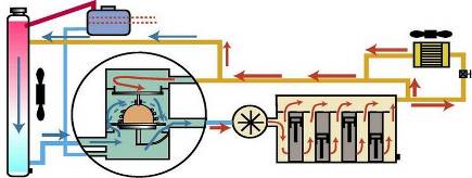 На рисунке 25 вы без труда можете различить два круга циркуляции охлаждающей жидкости. Малый круг циркуляции (стрелки красного цвета) служит для скорейшего прогрева холодного двигателя. А когда к красным стрелкам присоединяются синие, то, уже нагревшаяся жидкость, начинает циркулировать и по большому кругу, охлаждаясь в радиаторе. Руководит этим процессом автоматическое устройство - термостат.