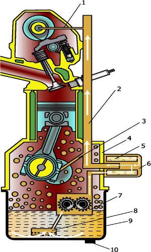 При вращении коленчатого вала, его кривошипы ударяют по поверхности масла в поддоне картера, при этом образуются масляные брызги и туман, которые попадают на зеркало цилиндров, поршень и поршневой палец. Все движущиеся детали кривошипно-шатунного и газораспределительного механизмов как бы купаются в масле. Этим достигается высокая износостойкость узлов современных двигателей.
