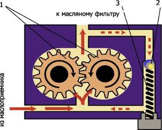 1 - шестерни масляного насоса; 2 - редукционный клапан; 3 –пружина