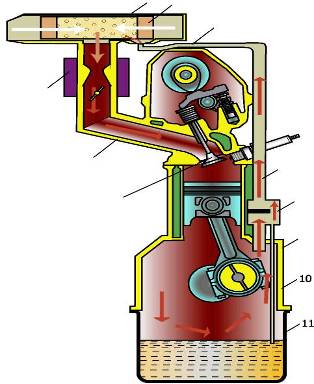 Для начала, давайте возьмем простейший одноцилиндровый карбюраторный двигатель (рис.6) и разберемся с принципом его работы. Рассмотрим протекающие в нем процессы, и выясним, наконец, откуда все-таки берется тот самый крутящий момент, который в конечном итоге приходит на ведущие колеса автомобиля.