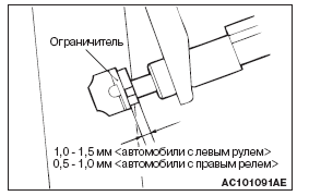 (7) Убедитесь в наличии зазора между выключателем стоп-сигнала и ограничителем, как это видно на рисунке. Проверьте, чтобы стоп-сигналы не зажигались при не нажатой педали тормоза.