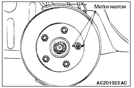 (1) Нанесите на шпильках и тормозном диске метки мелом в местах, где биение диска максимально, как показано на рисунке.