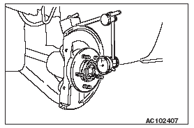 (2) Снимите тормозной диск. Установите индикатор часового типа как показано на рисунке и измерьте осевой люфт колесного подшипника путем перемещения ступицы колеса внутрь и наружу.
