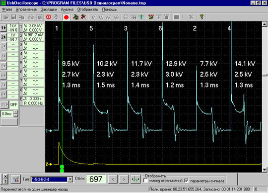 Відключивши бронепровід від свічі запалювання й підключивши його до пробійника, попередньо виставивши зазор рівний 10 мм, ми повністю імітуємо роботу свічі у двигуні в реальних умовах. Нагадаємо, що напруга іскроутворювання при цьому виходить не менш 30 кВ [1].