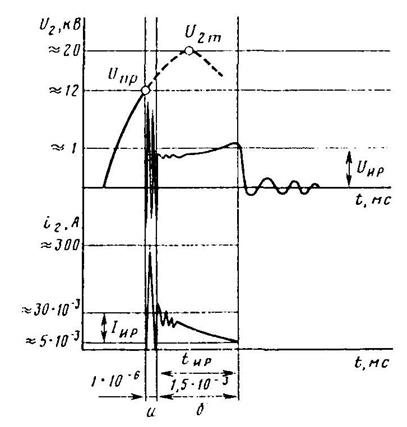 - напруга пробою - напруга у вторинному ланцюзі в момент утворення іскри - фактично - максимальна напруга у вторинному ланцюзі.