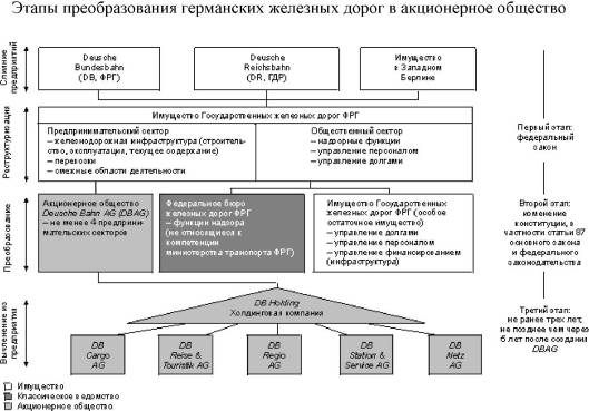 1 января 1994 года во Франкфурте-на-Майне было основано акционерное общество «Железные дороги Германии» (DBAG). Единственным акционером является государство. Этапы преобразования в акционерное общество п риведены на схеме.