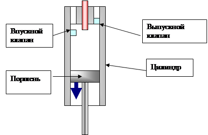 Впуск - поршень перемещается от верхней мертвой точки к нижней мертвой точке. Открыто впускное отверстие. Вследствие увеличения объема внутри цилиндра создается разрежение 0,075 - 0,085 МПа, а температура смеси находится в пределах 90 -125° С. Цилиндр заполняется свежим зарядом горючей смеси.