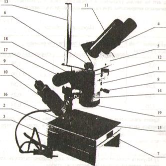 1 - барабан с корпусом; 2 - столик микроскопа; 3 - основание стола; 4 - кольцо диоптрийной наводки; 5 - бинокулярная насадка; 6 - рукоятка механизма изменения межзрачкового расстояния; 7 - фиксатор столика; 8 - винты, фиксирующие бинокулярную насадку; 9 - втулка осветителя; 10 - гайка осветителя; 11 -окулярная трубка; 12 - рукоятки переключения увеличений; 13 - стойка; 14 -объектив f = 90 мм; 15 - предметное стекло; 16 - держатели; 17 - рукоятка фокусировки; 18 - рукоятка регулировка хода; 19-кольцо