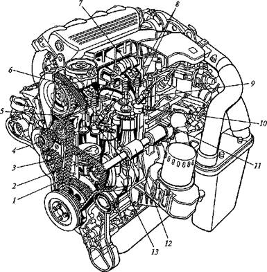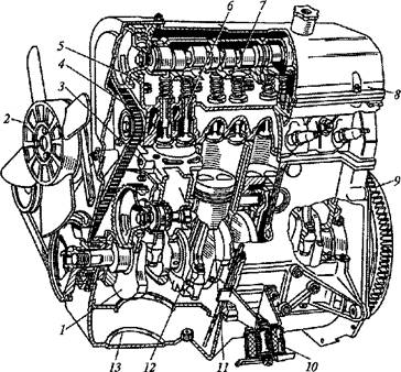 1 — коленчатый вал; 2 — вентилятор; 3 — блок цилиндров; 4 — зубчатый ремень; 5 — головка цилиндров; 6 — клапан; 7 — распределительный вал; 8 — крышка газораспределительного механизма; 9 — маховик; 10 — подушка передней опоры; 11 — поршень; 12 — шатун; 13 — масляный поддон