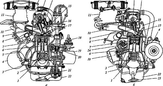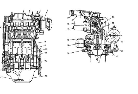1 – маслоприемник; 2 – масляный насос; 3 — головка цилиндров; 4 — крышка 13 головки цилиндров; 5 — распределительный вал; 6 — топливный насос; 7 — датчик—распределитель зажигания; 8 — поршень; 9 — шатун; 10— блок цилиндров; 11 — маховик; 12 — коленчатый вал; 13 — масляный поддон; 14, 24 — уравновешивающие валы; 15— масляный фильтр; 16— жидкостный насос; 17 — впускной трубопровод; 18— карбюратор; 19— воздушный фильтр; 20— клапан; 21 — свеча зажигания; 22 — генератор; 23— стартер