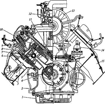 1 — масляный поддон; 2 — картер двигателя; 3 — регулятор температуры двигателя; 4 — коленчатый вал; 5 – шатун; 6 — цилиндр; 7 — поршень; 8 — свеча зажигания; 9 — головка цилиндров; 10 — клапан; 11 — распределительный вал; 12 — карбюратор; 13 — вентялятор; 14 — топливный насос; 15 — воздухоотводящий кожух.
