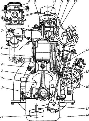 1 — коленчатый вал; 2 — шатун; 3 — блок цилиндров; 4 – поршень; 5 — гильза цилиндра; 6, 7 — выпускной и впускной трубопроводы; 8 — карбюратор; 9 — клапан; 10 — коромысло; 11 — штанга; 12 — головка цилиндров; 13 — свеча зажигания; 14 — толкатель; 15 — стартер; 16 — распределительный вал; 17 — масляный насос; 18 — масляный поддон; 19 — маслоприемник.