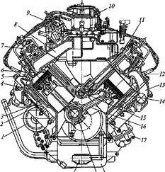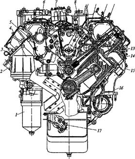 1 — масляный фильтр; 2 — маслозаливная горловина; 3 — указатель уровня масла; 4 — центробежный масляный фильтр; 5 — коробка термостатов; 6, 9 — передний и задний рым-болты; 7 — компрессор; 8 — насос гидроусилителя; 10 — Водосборная труба; 11 — факельная свеча; 12 — впускной воздухопровод; 13 — форсунка; 14 — скоба крепления форсунки; 15 — патрубок выпускного трубопровода; 16 — выпускной трубопровод; 17 — масляный насос.