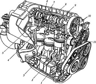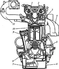 1 — распределительный вал впускных клапанов; 2 — распределительный вал; выпускных клапанов; 3 — головка цилиндров; 4, 11 — выпускной и впускной; трубопроводы; 5— блок цилиндров; 6— масляный поддон; 7— масляный насос; 8 — коленчатый вал; 9 — шатун; 10 — поршень