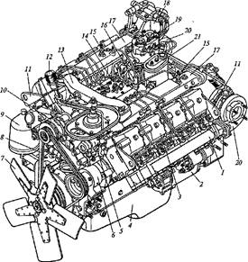 1, 17 — выпускной и впускной трубопроводы; 2 — стартер; 3 — головка цилиндров; 4 — масляный поддон; 5, 11 — кронштейны; 6 — жидкостный насос; 7 — вентилятор; 8 — приводвые ремни; 9 — центробежный масляный фильтр; 10 — генератор; 12 — рычаг переключения передач; 13 — объединительный патрубок; 14— крышка регулятора топливного насоса высокого давления; 15— факельные свечи; 16— электромагнитный клапан; 18— топливный фильтр; 19— компрессор; 20 — турбокомпрессоры; 21 — бачок насоса гидроусилителя.