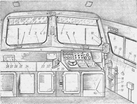 1 - стеклоочиститель; 2,6 - светозащитные шторы; 3 - горловина бака для воды на обмыв лобовых стекол; 4 - люк вентиляционный; 5 - локомотивный светофор; 7 - рукоятка включения воды для обмыва стекол; 8 - пульт управления; 9 - подсветка скоростемера; 10 - скоростсмер; 11 - панель сигнальных ламп; 12 - кран машиниста; 13 - кран вспомогательного тормоза; 14 - клапан тифона и свистка; 15-кнопка маневровой работы; 16-блокировочное устройство тормоза; 17-стоп-кран; 18- клапан ЭПК; 19-педаль песочницы; 20 -выключатель «Калорифер»; 21 - выключатель «Управление»; 22-пульт радиостанции; 23-люк прожектора; 24-бытовой холодильник; 25- тумблер «Освещение стола»; 26 - лампа «Белый огонь»; 27 - подсветка стола; 28 - розетка бытовая.