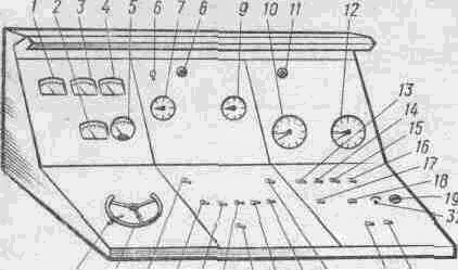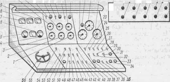 1-электротермометр «Вода З»; 2, 3 - электротермометры «I Вода 2» ; 4 - электроманометр «2 Масло З»; 5-электроманометр «Масло I»: 6-указатель повреждений; 7-амперметр «Ток зарядки батарей»; 8-вольтметр «Напряжение генератора»; 9 - амперметр «Нагрузка генератора»; 10, 12- электротермометры «I Масло 2»; 11-тумблер «Насос топливный I»; 13 - кнопка «Запуск I»; 14 - тумблер «Насос топливный 2» ; 15 - кнопка «Запуск 2» ; 16 - тумблер «Насос топливный З»; 17 - электротермометр «Масло З»; 18-кнопка «Запуск З» ; 19 - манометр «Тормозные цилиндры»; 20- кнопка «Аварийная остановка»; 21 - манометр «Уравнительный резервуар»; 22 - манометр «Питательная и тормозная магистраль» ; 23-26-тумблеры «Буферные фонари: передний левый, передний правый, задний левый, задний правый»; 27, 28- тумблеры «Прожектор: Ярко. Тускло»; 29- тумблер «Освещение пульта: Тускло»: 30-лампа «Бдительность»; З1 - потенциометр «Пульт»; 32 - тумблер освещения «Зеленый свет»; 33 - кнопка «Бдительность»; 34-кнопка «АЛСН»: 35- тумблер «Бдительность»; 36 -тумблер «Фильтр»; 37-кнопка «Песок 1 ось»; 38 - кнопка «Отпуск тормоза»; тумблеры; 36 - «Освещение кабины»: 40 - «Адсорбер»; 41 - «Управление переходом»; 42 - «Давление масла 2-З» ; 43-«Вентилятор холодильника»: 44 - «Пожар 1-З» ; 45-«Жалюзи верхние»; 46-«Указатель повреждений 2-3»; 47 - «Холостой ход З»; 48 - «Указатель повреждений I»; 49 - «Жалюзи масла верхние»; 50-кнопка «Вызов помощника»; тумблеры: 51-«Жалюзи воды и верхние»; 52 - «Холостой ход П» ; 53- «Управление холодильником»; 54 - «Управление тепловозом»; 55 - штурвал контроллера; 56- рукоятка реверсора; 57- «Сброс нагрузки I»; 58- «Сброс нагрузки 2»; 59-«I Пожар З» : 60-«Сброс нагрузки З» ; 61 -«Пожар 2»; 62-«Давление в картере»; 63-«Работа дизеля 2»; 64 - «Обрыв тормозной магистрали»; 65-«Работа дизеля З»; 66-«Заторможено»; 67 - «Реле заземления»
