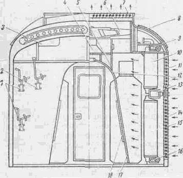 1,2 - привод боковых и верхних жалюзи; 3 - окно для перепуска теплого воздуха из шахты в дизельное помещение; 4 - подпятник колеса вентилятора; 5 - обтекатель; 6 - колесо вентилятора; 7 - жалюзи верхние; 8-люк вентиляционный: 9-коллектор верхний; 10- секции холодильника верхние; 11, 14 - жалюзи боковые верхние и нижние; 12 - арка; 13 - коллектор средний; 15 ~ секции холодильника нижние; 16 - коллектор нижний; 17 -- стенка наклонная; 18 - люк монтажный