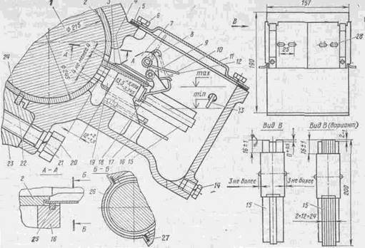 Тяговый редуктор защищен кожухом. Нижняя 2 и верхняя 3 половины кожуха скреплены между собой по лапам через дистанционные прокладки 9 четырьмя болтами 8 с корончатыми гайками 10 и крепятся к тяговому электродвигателю тремя болтами 11. Момент затяжки болтов 8 должен быть в пределах 245+49 Н * м (25+5 кгс * м), а болтов 11 - 1570+196 H * м (1604 "20 кгс • м). На обечайке верхней половины кожуха размещен сапун 5, а нижней половины - заливная горловина с пробкой 1. Уплотнением пробки служит резиновая прокладка. Нижняя кромка отверстия горловины является верхним уровнем смазки в кожухе. По разъему верхней половине приварены разновысокие накладки: наружные 17-фасонные и внутренние 20-плоские, между ними уложена резиновая трубка 18 и заложена смазка.