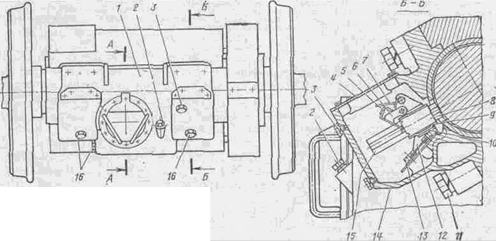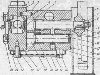 Моторно-осевой подшипник. Тяговый электродвигатель ЭД118А опирается на ось колесной пары через два разъемных моторно-осевых подшипника (рис. 7). Верхний вкладыш 24 устанавливается в прилив остова двигателя, а нижний 2, имеющий окно под пакет фитилей 15 смазывающего устройства, в корпус подшипника 16, который крепится к остову двигателя четырьмя болтами 20. От поворота вкладыши удерживаются шпонкой 22.