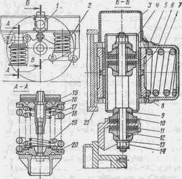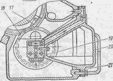 1 - единый осевой подшипник; 2 - пробка заправочной горловины: 3 - пробка для контроля уровня смазки; 4, 20 - крышки; 5 - пружина; 6 - рычаг; 7-фиксатор; 8-коробка; 9 - пружина пластинчатая; 10 - направляющая корпуса; П. 13- болты; 12 - корпус польстера; 14 - корпус подшипника; 15 - пакет фитилей: 16 - пробки сливные; 17, 18 - шестерни; 19 - насос шестеренный; 21 - прокладка