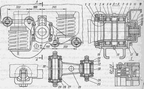 1-кольцо лабиринтное; 2, 16-болты; 3, 9-крышки задняя и передняя; 4-корпус буксы; 5, 8 - роликовые подшипники; 6, 7 - кольца дистанционные; 10 - кронштейн; 11 - шариковый подшипник упорный; 11, 17 - кольца; 13-упор; 14-амортизатор; 15- пружина: 18 - пробка отверстия для пополнения консистентной смазки в буксу; 19 - нитка шелковая; 20, 27 - шайбы наружная и внутренняя; 21-торцовый амортизатор; 22 - штифт; 23 - втулка; 24-полукольцо упорное разъемное;25-валик короткий; 26-поводок; 28 - втулка резиновая; 29-валик длинный; 30 - полукольцо дистанционное
