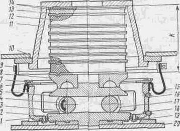 1 – корпус; 2,5,8,13 – опоры; 3 – ролик; 4 – втулка; 6 – крышка; 7,19 – болты; 9 – хомут; 10 – рама тепловоза; 11 – стакан; 12 – элемент резинометаллический; 14 – шайба регулировочные; 15 – чехол; 16,18 – пробки; 17 – обойма; 20 – рама тепловоза.