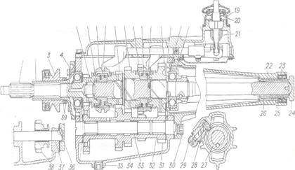 Рис. 105 . Коробка передач (продольный разрез): 1 - первичный вал; 2 - крышка подшипника первичного вала; 3 - муфта подшипника выключения сцепления; 4 - задний подшипник первичного вала; 5 - роликовый подшипник; 6 - стопорное кольцо; 7 - муфта включения III и IV передач; 8 - ступица муфты включения III и ГУ передач; 9 - шестерня III передачи; 10 - шестерня II передачи; 11 - муфта включения I и II передач; 12 - ступица муфты включения I и II передач; 13,15 - упорные шайбы; 14 - шестерня I передачи; 16 - стопорное кольцо; 17 - подшипник; 18 - верхняя крышка коробки передач; 19 - колпак; 20 - седло пружины; 21 - рычаг переключения передач; 22 - удлинитель; 23 - манжеты; 24 - ремонтная заглушка; 25 - сталебаббитовый подшипник; 26 - вторичный вал; 27 - ведущая шестерня привода спидометра; 28 - ведомая шестерня привода спидометра; 29 - штуцер; 30 - пробка; 31 - блок шестерен; 32 - игольчатый подшипник; 33 - ось блока шестерен; 34 - картер ; 35 - пробка маслосливного отверстия; 36 - штифт; 37 - ось промежуточной шестерни заднего хода; 38 -промежуточная шестерня заднего хода; 39 - поролоновые защитные кольца.