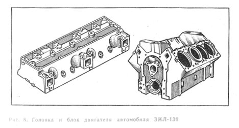 Блоки цилиндров отливают из чугуна (двигатель ЗИЛ-130), легированного чугуна (двигатели ЯМЗ) или из алюминиевого сплава (двигатели ГАЗ-53, ГАЗ-24); головки — из чугуна (двигатели ЯМЗ) или алюминиевого сплава (двигатели ГАЗ-53, ГАЗ-24, ЗИЛ-130).