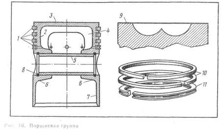 Детали поршневой группы изображены на рис. 10. Поршень имеет днище 3 с усиливающими ребрами 4, которые отводят тепло к стенкам 2. В поршне имеются выточки, где расположены пружинящие кольца /, 10 и //, плотно прилегающие к стенкам цилиндра и тем самым препятствующие проходу газов между поршнем и цилиндром; для размещения колец соответствующая часть поршня утолщается. В средней части поршня имеются бобышки 6 с отверстиями для поршневого пальца 5, удерживаемого стопорными кольцами 8; нижняя часть поршня 7, называемая юбкой, служит для направления движения поршня и передачи боковых усилий на стенки цилиндра.