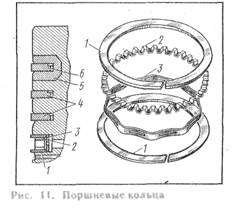 Особенно тщательно выполнена кольцевая группа в двигателе ЗИЛ-130 (рис. 11), состоящая из трех верхних компрессионных колец и одного нижнего маслосъемного. Главное (верхнее) компрессионное кольцо 6 находится в кольце 5, залитом в поршень для упрочнения канавки; нижнее и среднее компрессионные кольца 4, как обычно, находятся непосредственно в теле поршня. Маслосъемное кольцо составлено из двух дисковых колец /, распираемых радиальным 3 и осевым 2 расширителями.
