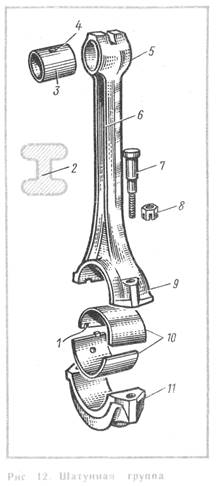 Шатун совершает сложное движение: верхняя его головка движется прямолинейно вместе с поршнем, а нижняя вращается вместе с шатунной шейкой коленчатого вала; при помощи шатуна поступательное движение поршня преобразуется во вращательное движение коленчатого вала. Одновременно шатунами от поршня к валу передаются меняющиеся в широких пределах усилия от давления газов и сил инерции. Шатун состоит из двухосновных частей: стержня 6 (рис. 12) с верхней 5 и нижней 9 головками и крышки . Шатун работает в тяжелых условиях, поэтому для обеспечения повышенной прочности шатуна поперечное сечение 2 его стержня выполняется двутавровым, расширяющимся к нижней головке. Для уменьшения трения и износа поршневого пальца в верхней головке шатуна запрессовывается бронзовая втулка 3, для смазки трущихся поверхностей имеются отверстия 4.