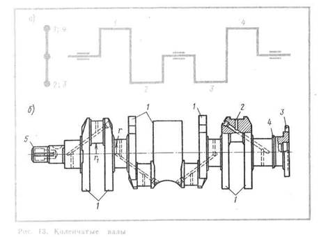 Форма коленчатого вала определяется числом цилиндров и тактов, последовательностью чередования рабочих процессов по цилиндрам, а также уравновешиванием двигателя.