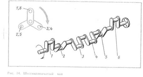 Чтобы обеспечить равномерное чередование вспышек и уравновешенность, коленчатые валы шестицилиндровых рядных двигателей чаще всего выполняют по наиболее распространенной форме, изображенной на рис. 14 с порядком работы 1—5—3—6—2—4 (табл. 3).