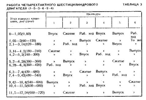 Коленчатый вал такой формы создает одинаковое направление движения двух крайних поршней и противоположное ему направление движения двух средних поршней. Исходя из этого необходимо распределить такты по цилиндрам с учетом осуществления равномерного чередования вспышек (рабочих ходов) через 3,14 рад (180°), угла поворота вала (половину оборота вала). Для фиксации последовательности протекания тактов по всем цилиндрам исходным цилиндром принимают первый, и ему приписывают установленный выше цикл, начиная с первого такта впуска. Чтобы в четвертом цилиндре, поршень которого движется по направлению движения первого поршня (вниз), не получилась вспышка одновременно со вспышкой в первом цилиндре, необходимо первый ход четвертого поршня (вниз) сделать отличающимся от хода первого поршня. Таким ходом вниз может быть только расширение с последующим выпуском, всасыванием н сжатием; для поршней 2 и 3, одновременно поднимающихся вверх, возможными ходами являются выпуск и сжатие. Если выпуск протекает во втором цилиндре, то в третьем будет единственно возможный (по условию несовпадения ходов) ход сжатия, и наоборот, если во втором цилиндре будет сжатие, то в третьем должен быть выпуск. В результате для четырехцилиндрового двигателя получаются две возможные последовательности рабочих ходов по номерам цилиндров, приведенные в табл. 2: 4—3—1—2 и 4—2—1—3. Если же начать отсчет с первого цилиндра, то порядок (последовательности) работы будет такой: 1—2—4—3 и 1—3—4—2.