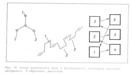 В V-образных двигателях каждая шатунная шейка коленчатого вала связана с двумя шатунами и одна группа цилиндров немного сдвинута относительно другой (рис. 15—для двигателя ЯМЗ-236, при порядке работы цилиндров 1—4—2—5—3—6). Сдвиг цилиндров у двигателей ЯМЗ-236 и ЯМЗ-238 равен 35 мм.