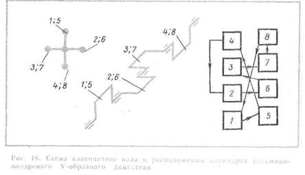 На рис. 16 показаны схемы коленчатого вала и расположения цилиндров V-образного восьмицилиндрового двигателя. Порядок (заботы таких двигателей следующий: 1—5—4—2—6—3—7—8. Угол между плоскостями осей цилиндров обычно равен 1,57 рад (90"); такой угол в сочетании с крестообразным расположением кривошипов коленчатого вала обеспечивает полную уравновешенность двигателя.