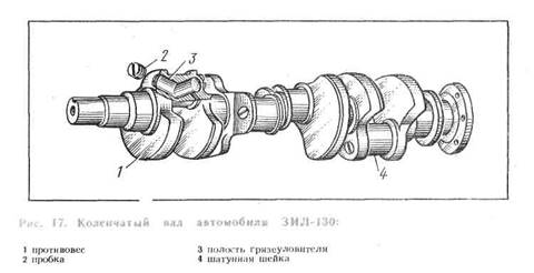 Устройство коленчатого вала двигателя ЗИЛ-130 показано на рис. 17. Для современных валов характерно наличие в каждой шатунной шейке полости 3 для центробежного (за счет центробежных сил вращения) улавливания грязи из масла, подаваемого к шейкам.