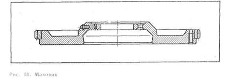 На заднем конце коленчатого вала размещается массивная дисковая деталь — маховик (рис. 18). Он болтами крепится к фланцу коленчатого вала и снабжен напрессованным стальным зубчатым венцом, служащим для пуска двигателя от электрического стартера. Общее назначение маховика — обеспечить равномерное вращение коленчатого вала путем поглощения энергии от рабочего такта с последующей отдачей ее коленчатому валу для совершения остальных тактов и проведения деталей кривошипного механизма через мертвые точки.